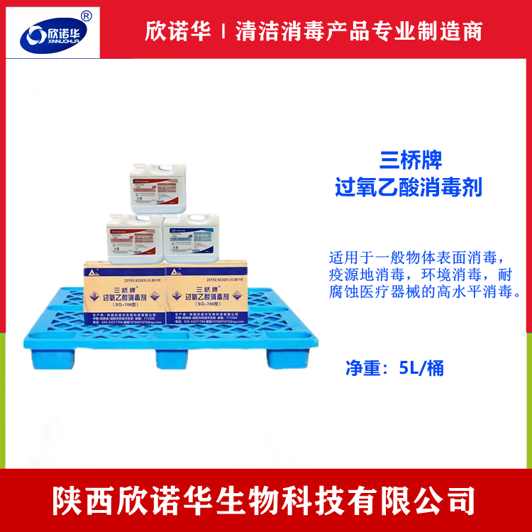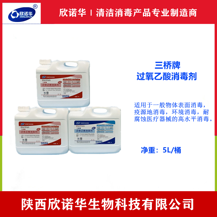 醫(yī)用過氧乙酸消毒劑廠家-陜西欣諾華生物科技有限公司,產(chǎn)品名稱:三橋牌過氧乙酸消毒劑(SQ-706型)產(chǎn)品性能:本品是以過氧乙酸為主要有效成分的高效消毒液,可殺滅大腸桿菌,金黃色葡萄球菌,枯草桿菌黑色變種芽孢。